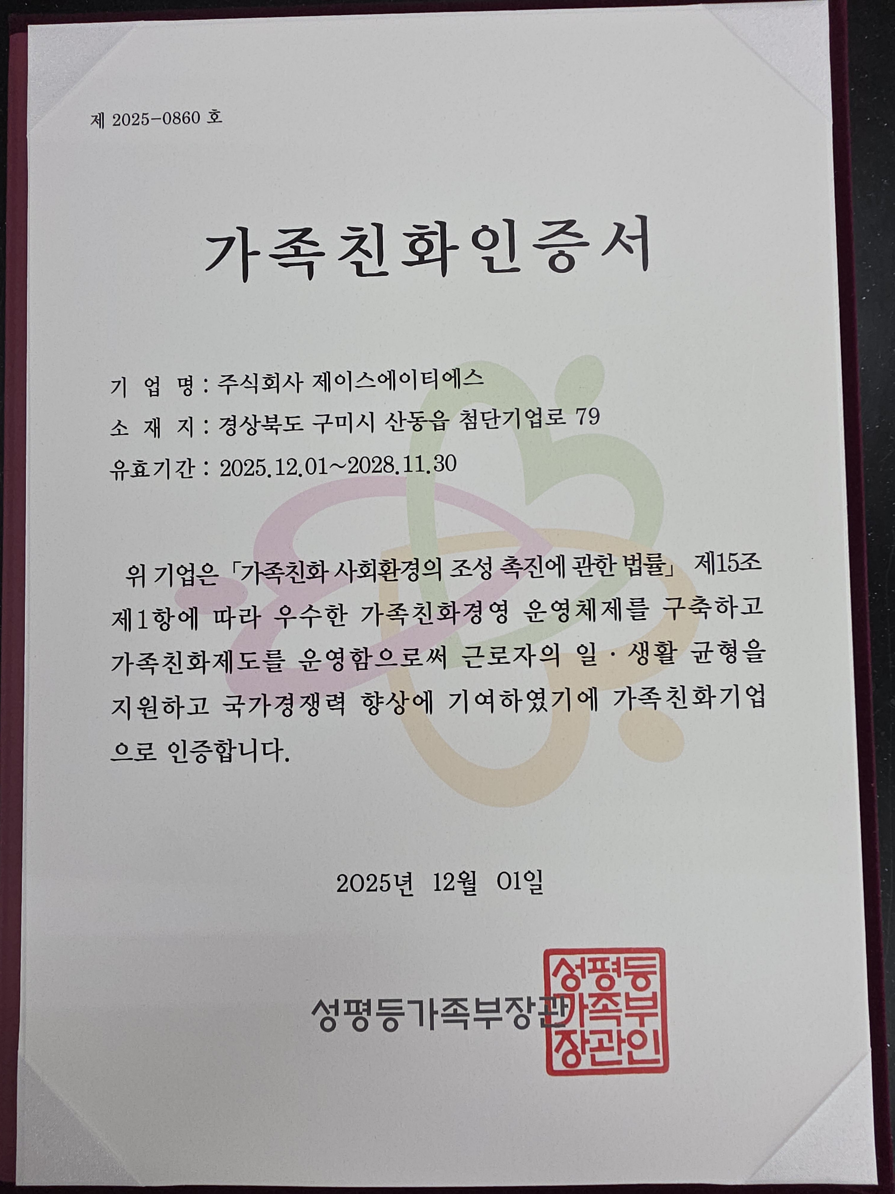 2025년 가족친화 우수기업 선정 페이지 정보 작성자 최고관리자 댓글 0건 조회 18회 작성일 26-03-23 15:42 목록 답변 본문 다음글2024년 중소기업인대회 - 대통령 표창 수상 24.06.27 댓글 0 댓글목록 등록된 댓글이 없습니다.